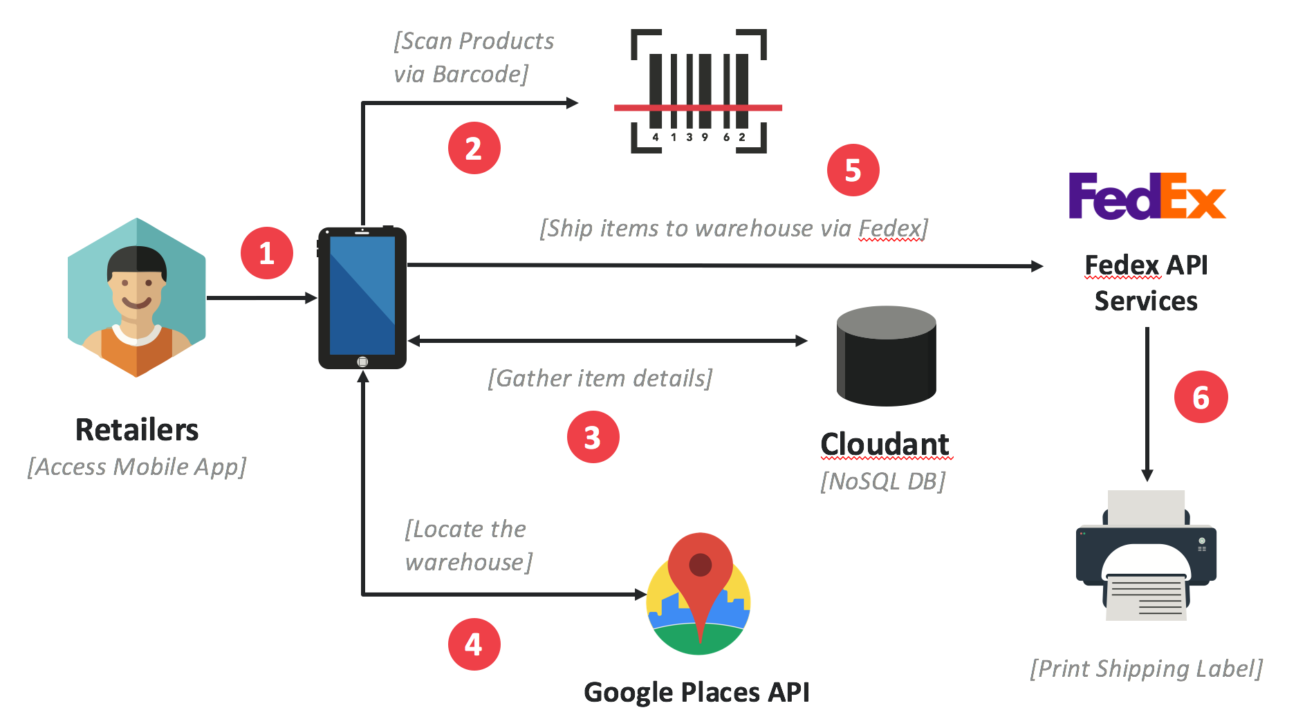 The solution is built as a Hybrid Mobile Application with Ionic Framework, while the Node JS based backend is deployed on IBM Bluemix. The application also integrates with Fedex's API for shipping goods, applying coupons and tracking packages.